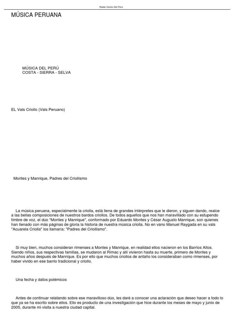 27.10.2016 · la música en el perú (primera parte) el combinar sonidos, respetando armonías, melodías y ritmos es música... 14.03.2014 · se empiezan a realizar importantes trabajos de etnografía en los que hay que destacar el realizado por el alemán enrique brunning, quien desde 1910 hizo diversos registros de música tradicional de lambayeque, piura y cajamarca. Esta puesta en escena celebrará el centenario de la vida de la icónica artista nacional. Esto se debe a que se pudieron encontrar diversos ….. Esta puesta en escena celebrará el centenario de la vida de la icónica artista nacional.